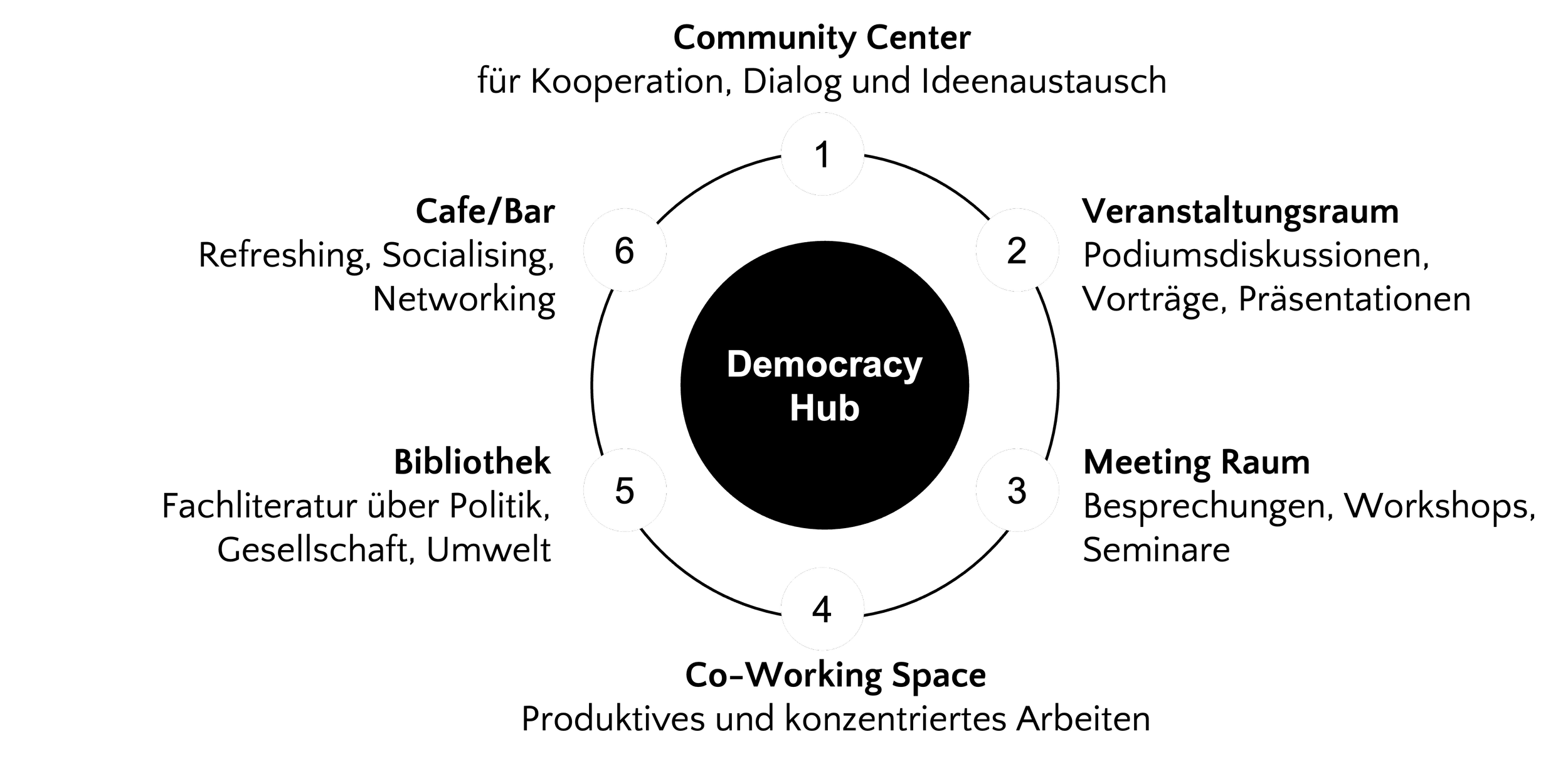 Wir möchten einen Lebensraum für die Vernetzung der Zivilgesellschaft, Wissenschaft und Politik schaffen. Das Democracy Hub wird ein lebendiger Ort, der möglichst niederschwellig und zugänglich ist und wo verschiedene Initiativen zusammenarbeiten, Ideen austauschen und Veranstaltungen organisieren.